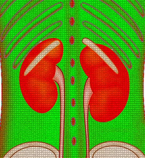 신장 결석입니다. 신장에서 생산된 석회나 요소가 요관으로 이동 중에 갇혀 생기는 돌로, 발생한 위치와 크기에 따라 혈뇨 증상이 나타날 수 있습니다.
