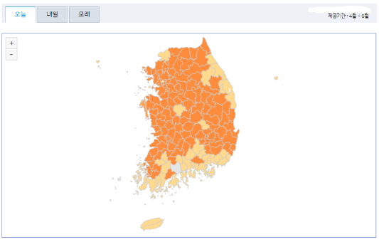 기상조건(기온, 풍속, 강수, 습도)에 따른 꽃가루농도를 예측하여 알레르기 질환 발생 가능 정도를 지수화하여 나타낸 것으로 4~6월(참나무, 소나무), 8~10월(잡초류) 서비스하며, 일 2회(6시, 18시) 제공하고 있습니다.