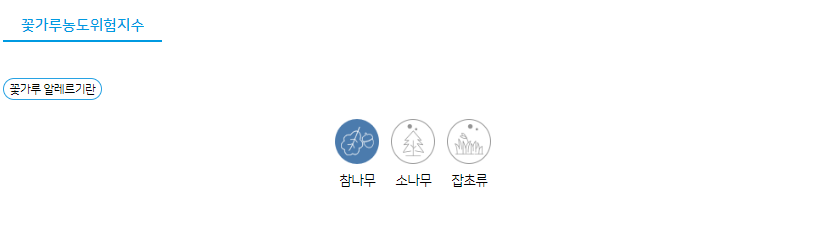 기상조건(기온, 풍속, 강수, 습도)에 따른 꽃가루농도를 예측하여 알레르기 질환 발생 가능 정도를 지수화하여 나타낸 것으로 4~6월(참나무, 소나무), 8~10월(잡초류) 서비스하며, 일 2회(6시, 18시) 제공하고 있습니다.